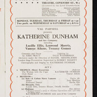 The production presented a unique review of dances from the West Indies, South America and West Africa based on Katherine Dunham's in depth anthropological research. It included L'Ag'ya, a piece devised by Dunham and set in 18th century Martinique. The piece displayed African and West Indian dances to tell a story of love and revenge culminating in the Ag'ya, the fighting dance of Martinique. Katherine Dunham was one of the groundbreaking African American choreographers who contributed to the development of African dance aesthetics internationally.