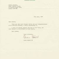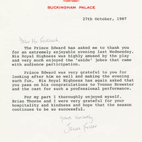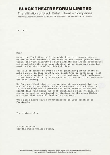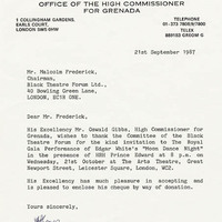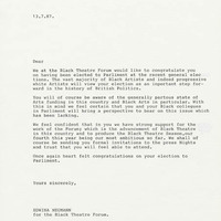 Fourth Black Theatre Season information and administration. Correspondence and responses to invitation to the Royal Gala Performance of Moon Dance Night by Edgar White. Letters of thanks including Prince Edward's. Letters from the House of Commons regarding the opening event of the Black Theatre Season 1987. Includes a RSVP card from MPs Paul Boateng and Diane Abbott. Invitation letters describe the highlights of the festival to guests. Response letters are thank-you notes or apologies for not attending event.
