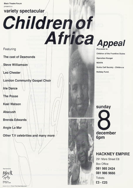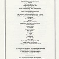 Black Theatre: the next stage by Clive Davis (photocopy of article) and other references in invitation list folder. Masterclasses flyer (1992); programme presenting artists with portrait shots, giving a summary of the plays; brochure on the Children of Africa charity event.