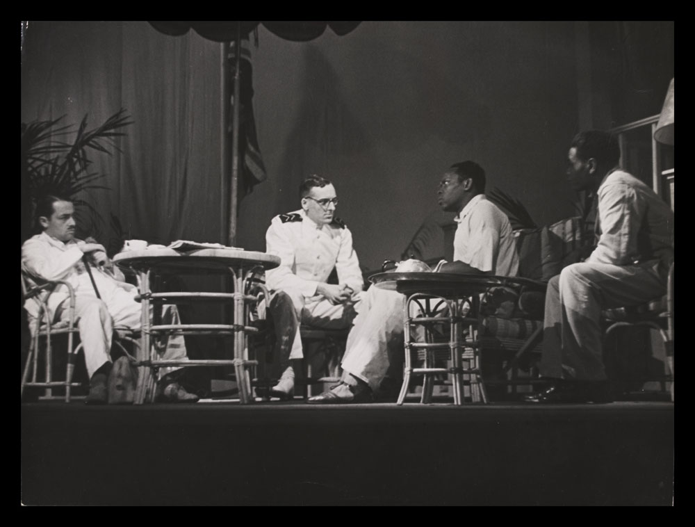 Black and white photograph of actors on stage in the Colony