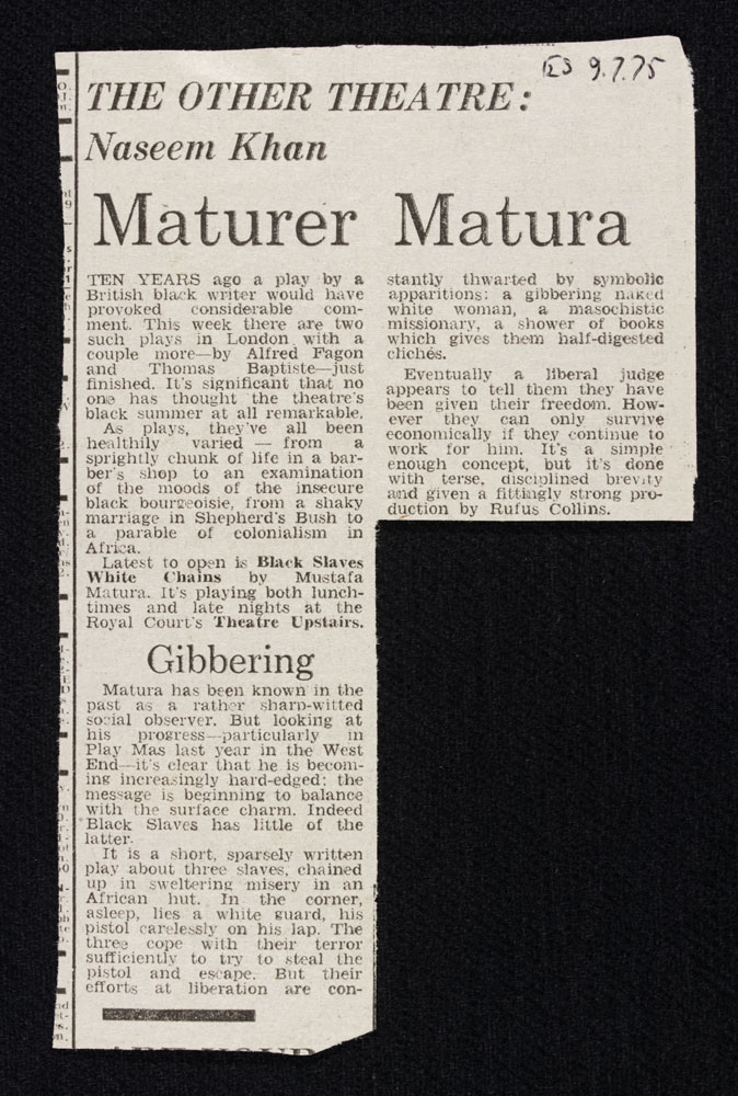 Maturer Matura: a newspaper article reviewing Black Slaves White Chains