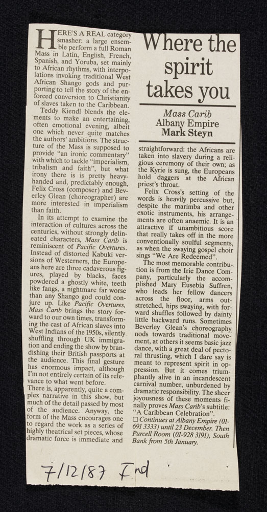 Where The Spirit Takes You: a newspaper cutting reviewing Mass Carib