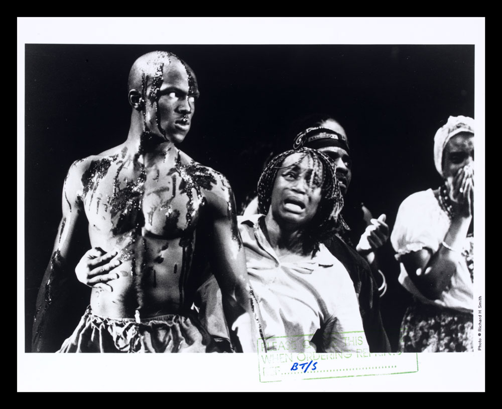 Black and white photo of bare-chested man with crying woman from Zumbi