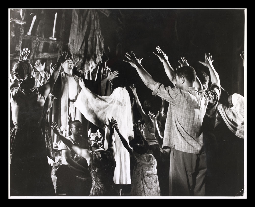 Black and white photograph of actors on stage in Flesh to a Tiger