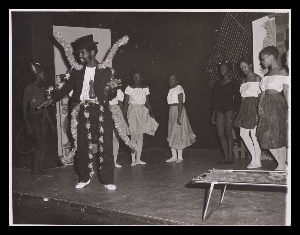 Six black and white photographs of actors on stage in Anansi and Brer Englishman