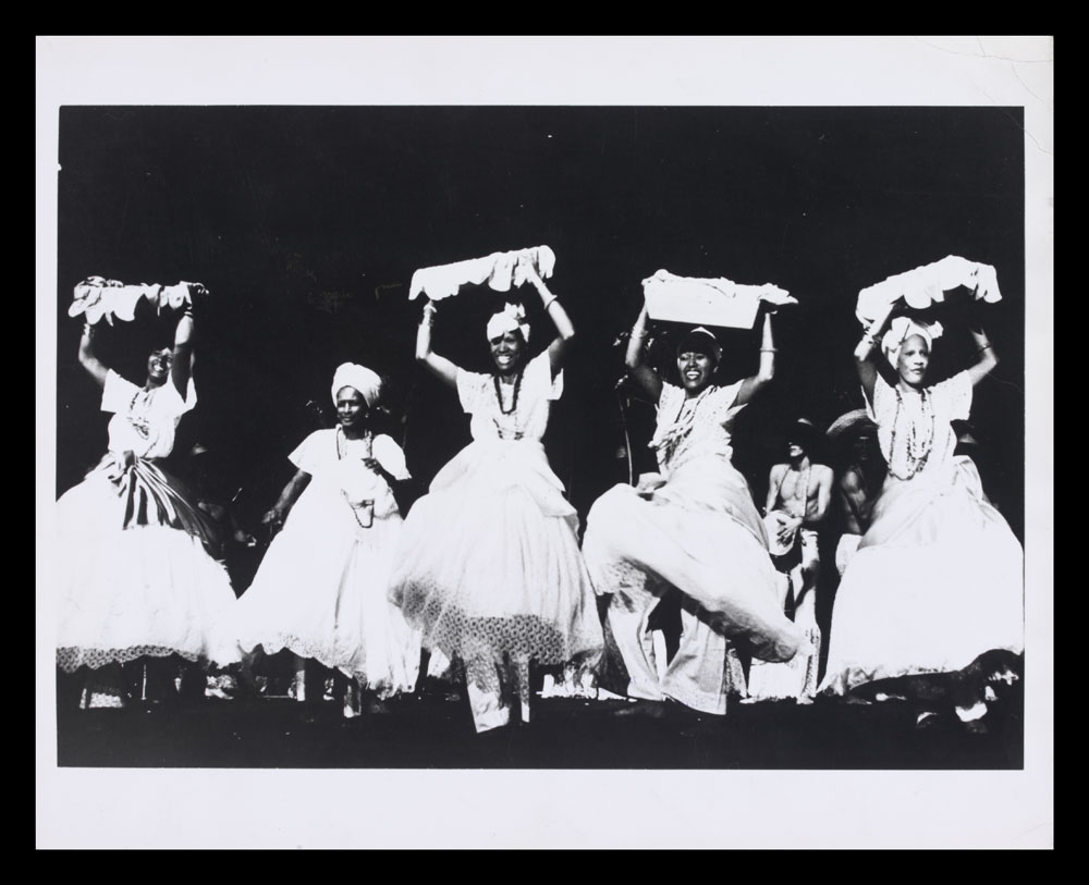 Black and white photograph of performers on stage in The Capoeiras of Bahia