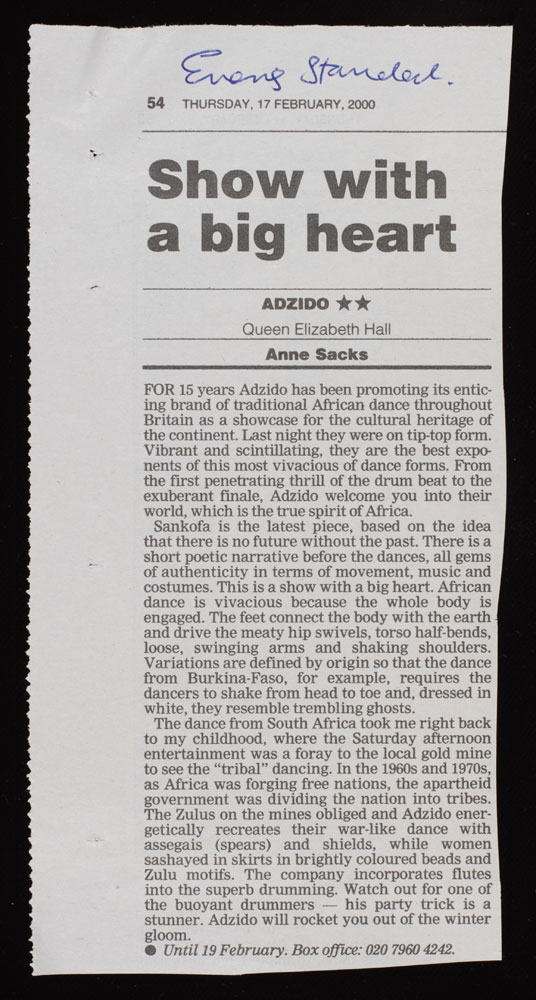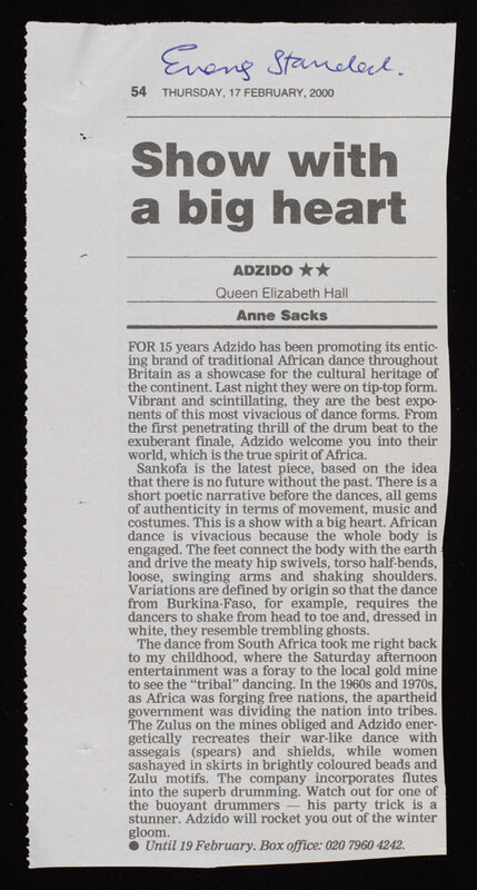 Show with a big heart': a newspaper article reviewing Adzido's Sankofa.
