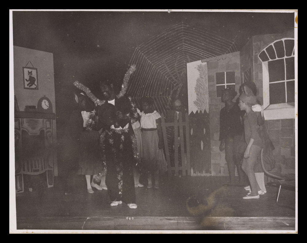Six black and white photographs of actors on stage in Anansi and Brer Englishman 3