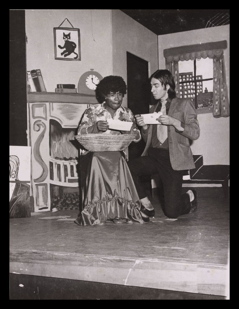 Six black and white photographs of actors on stage in Anansi and Brer Englishman 4