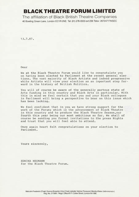 Letter from the Black Theatre Forum to the newly elected MP Diane Abbott offering congratulations on being elected to Parliament and soliciting support to Black Arts (13 July 1987).
