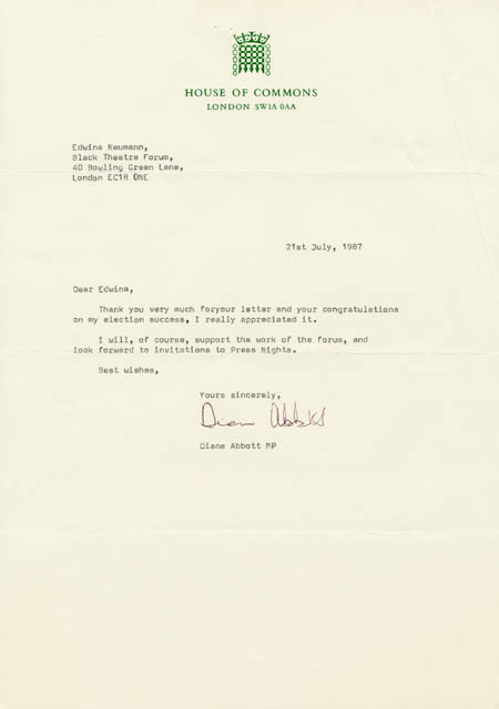 Reply from Diane Abbot MP to the Black Theatre Forum expressing interest in the activities of the Forum.