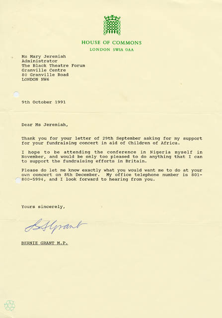 Letter from Bernie Grant MP to Mary Jeremiah, Administrator of the Black Theatre Forum, in response to her letter regarding the "Children of Africa" event (9th Oct 1991).