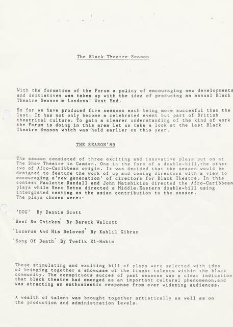 Black Theatre Season 1989: press release.
