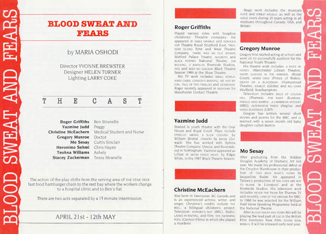 Blood, Sweat and Fears by Maria Oshodi: colour leaflets and programme along with a black and white photograph of the play.