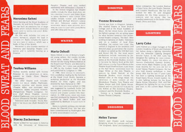 Blood, Sweat and Fears by Maria Oshodi: colour leaflets and programme along with a black and white photograph of the play.