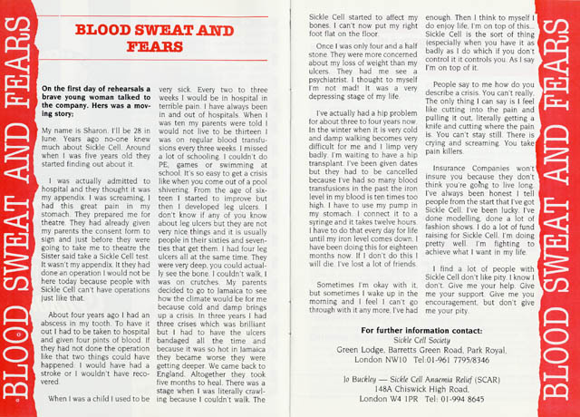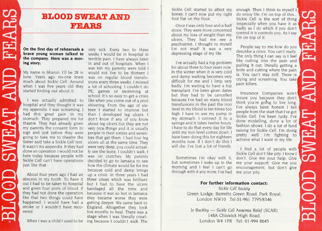 Blood, Sweat and Fears by Maria Oshodi: colour leaflets and programme along with a black and white photograph of the play.