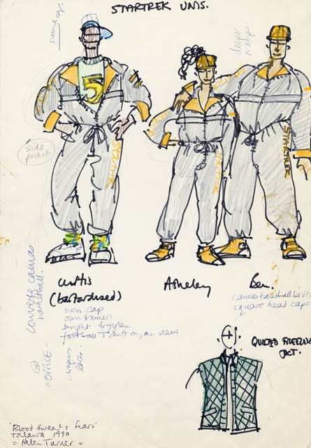 Colour drawing by Helen Turner of costume design for Ashley in “Blood, Sweat and Fears”.