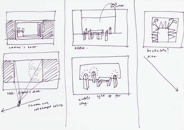 Rough pencil sketches of set designs and light effects.