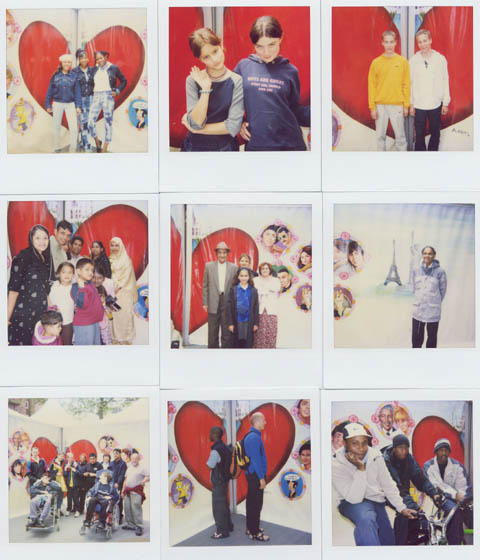 Collage of nine polaroid photographs of members of the audience taken outside installation marquees.
