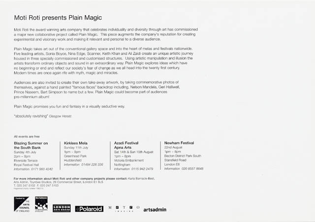 Both sides of the flyer for the tour at the Blazing Summer, South Bank, Kirklees Mela, Azadi Festival and Newham Festival. 4th July-22nd Aug, 1999.