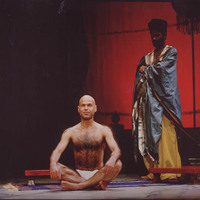 Pictures of this Sanskrit history play show: 1) colour photograph: two actors on stage, one of the actors sitting with legs crossed, the other stands beside him dressed in historical costume. Red background. 2) Colour picture: actor Renu Setna rehearsing. He stands alone on stage in the spot light, dressed in black, posing with arms in the air. 3) & 4) two black and white shots of scenes.