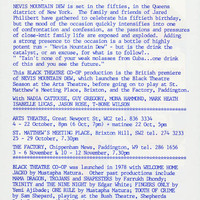 Nevis Mountain Dew by Steve Carter. The play is set in the Queens district of New York during the 1950s. Jared Philibert is celebrating his fiftieth birthday and the mood of the occasion intensifies as the passions and pressures of a close-knit family are exposed. Adding an explosive element to the occasion is a bottle of highly potent rum which becomes a catalyst for the characters’ disclosure of feelings and personal stories. Director: Rufus Collins. Cast: Nadia Cattouse, Guy Gregory, Mona Hammond, T-Bone Wilson, Mark Heath, Isabelle Lucas, Jason Rose. Performed at the Arts Theatre, London (04/10/1983 – 22/10/1983); St Matthew’s Meeting Place, Brixton (25/10/1983 - 29/10/1983), and The Factory, Paddington (03/11/1983 - 06/11/1983 & 10/11/1983 -12/11/1983).
