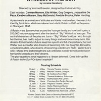 A Raisin in the Sun by Lorraine Hansberry. The play portrays Big Walter Lee Younger's family, which at his death is left to decide how to spend a $10,000 life insurance payment. The story unfolds with his son Walter Lee, a chauffeur who dreams of becoming rich, his daughter Beneatha who is a medical student, and his widow Lena who mediates between the family's needs and dreams. Director: Yvonne Brewster. Cast: Carmen Munroe, Gary McDonald, Peter Harding, Jacqueline de Peza, Freddie Brooks, Guy Gregory, Ella Wilder and Kwabena Manso. Performed at The Tricycle Theatre (11/04/1985 - 04/05/1985) and The Drill Hall Arts Centre (09/07/1985 - 20/07/1985).
