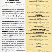 Splendid Mummer (The Life of Ira Aldridge) by Lonne Elder III. The play traces the life of celebrated Black actor Ira Aldridge from his youth in New York to his eventual rise to stardom in Europe with references to the many honours he gained with his performances of Macbeth, King Lear, and Othello from the mid 1830s to the mid 1860s. Director: Anton Phillips. Cast: Malcolm Frederick. Performed at The Kings Head, London (07/10/1991- 03/11/1991) and on Tour.