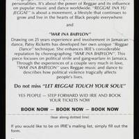 A dance drama in two parts: Reggae Ina Yu Jeggae and War Ina Babylon. The production explores the development of reggae, a political and spiritual movement which evolved in the Caribbean