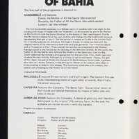 This was a programme of traditional dances including rituals such as Candomblé, and dances such as Malculelê, Capoeira and Samba de Roda originated in West Africa and developed in Brazil as forms of religious ritual dancing mixing African, European and South American Indian elements. The programme opened with a Candomblé ritual which, as a religion, is practiced in the Bahian region and other parts of Brazil and retains connections with African Voodoo. It included a Capoeira piece, a dance/fight based on a traditional African way of fighting with the feet, originally developed by Brazilian slaves to defend themselves and their freed villages.