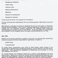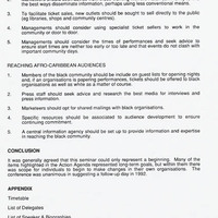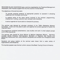 Content of letters: cultural contacts directory-database; information on Black Arts Networking, Reaching Audiences seminar, Theatrical Management Association, Reaching Black Audiences conference (1991).