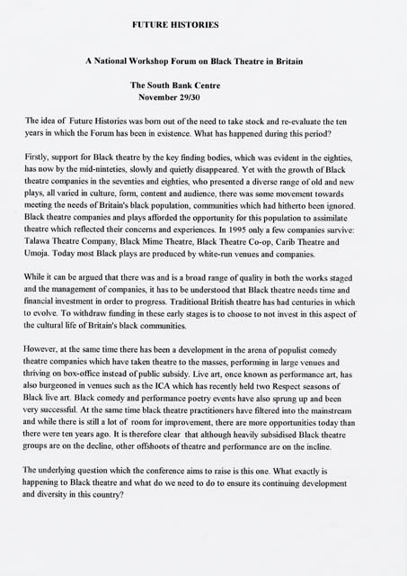The file includes Mission Statement, correspondence with funding bodies with hand written notes on fundraising strategy; general information on: Gulbenkian Foundation, The Paul Hamlyn Foundation, London Arts Board, The Arts Council of England