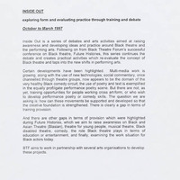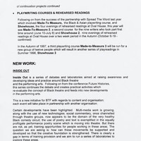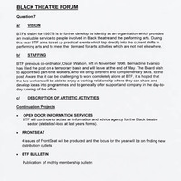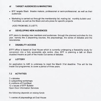 Hand written notes on funding and development of ideas; finance files; theatre companies repertory; art organisations and people's details (record on recycled paper; only one side is to be read); working party agenda of meeting (1998); Board of Directors correspondence; BTF Activities for 1997-1998 at a Glance; database and indexes; marketing correspondence on property prospect for the organisation; The Green List: contact list of dance companies and artists from Arts Council of Great Britain; press article by Peter Cheeseman on training.