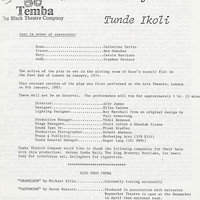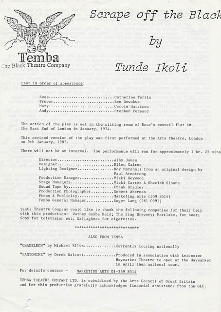 Copy of the first page of the play programme listing actors Catherine Terris, Ben Onwukwe, Carole Harrison, Stephen Persaud and director Alby James. The play was part of the Black Theater Season 1985.