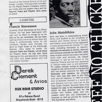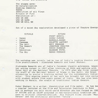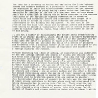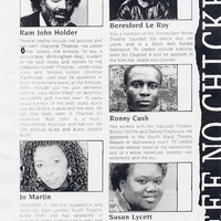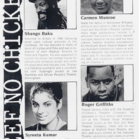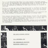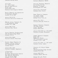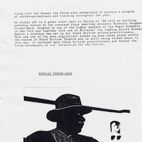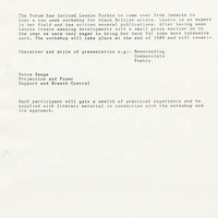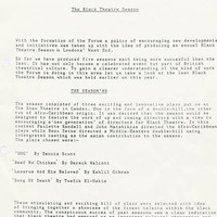 The Black Theatre Forum Limited compiled documentation to present the 1989 theatre festival and their five year plan. Details include summaries of the plays and artists, and technicians biographies (including photographs). Presentation of Linkages - the acting workshop in cinema and theatre; training structure along with other workshops (including photographs); company members list. Presentation of the American artist director Douglass Turner-Ward, founder members of the Negro Ensemble.
