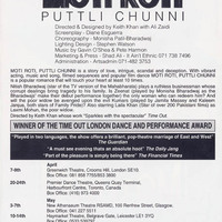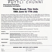 Commissioners/Funders: Theatre Royal Stratford East, London International Festival of Theatre, Baring Foundation, Hamlyn Foundation, International Initiatives, Arts Council of Britain, London Arts Board. Artistic Directors: Ali Zaidi, Keith Khan; collaborators Diane Esguerra, Gavin O'Shea; performers: Nittish Bharadwaj, Nina Wadia, Jamila Massey, Mamta Kaash, Pravesh Kumar, Kaleem Janjua, Laila Khan, Ajay Chhabra, Shobna Gulati, Nayesh Radia.