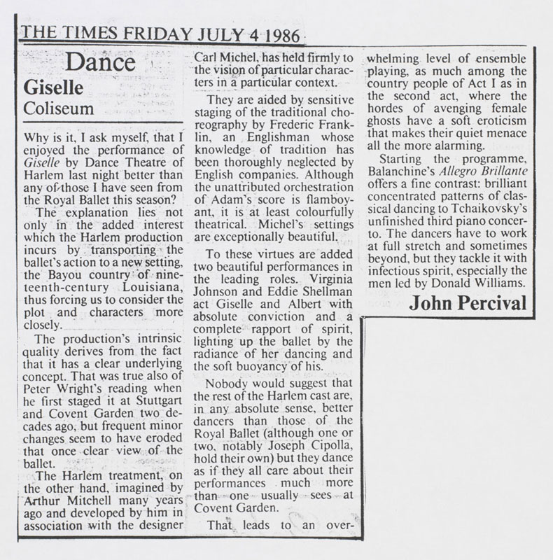 Newspaper article reviewing Giselle by John Percival.