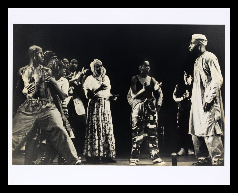 B&W photo of actors on stage, some clapping, from Zumbi