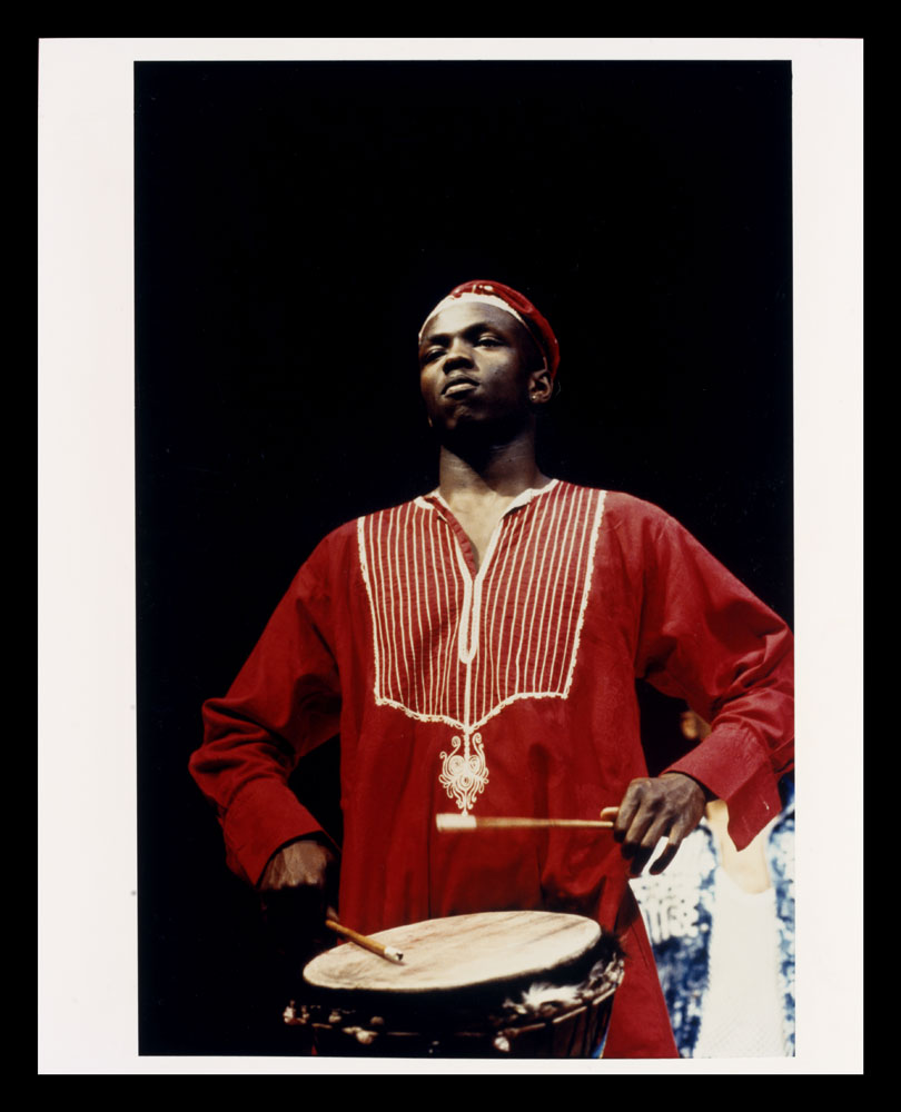 Colour photo of man wearing red with drum from Zumbi
