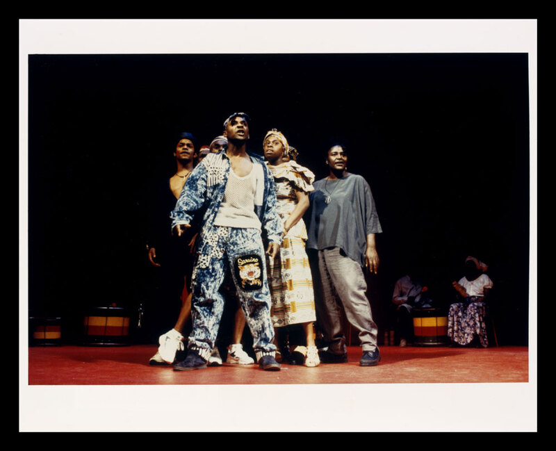 Colour photo of actors on stage, man in denim in front, from Zumbi
