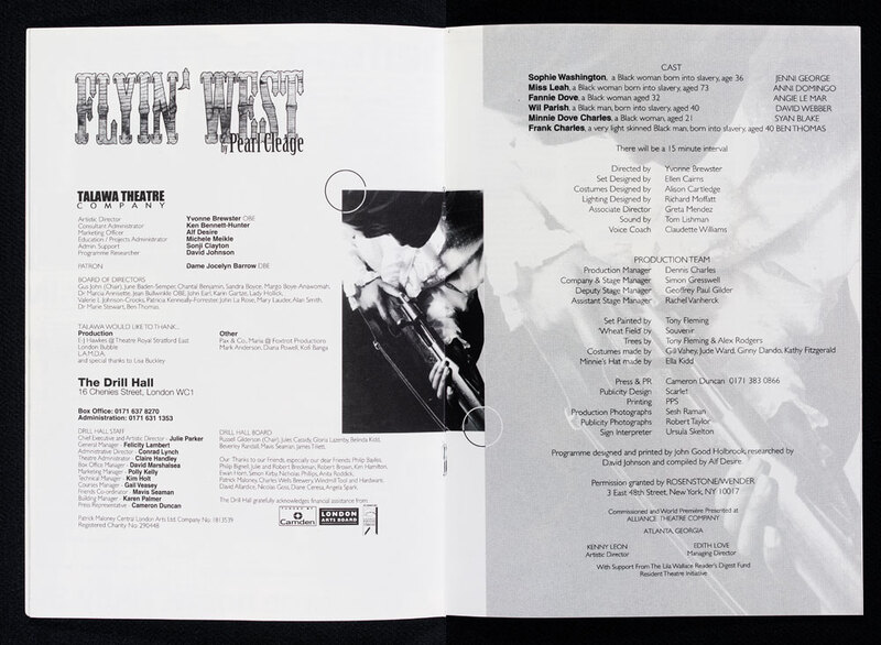 Researched and compiled by David Johnson and Alf Desire. Design: Scarlet. Photo: Robert Taylor (www.taylor-photo.co.uk). Programme: Talawa Theatre Company.