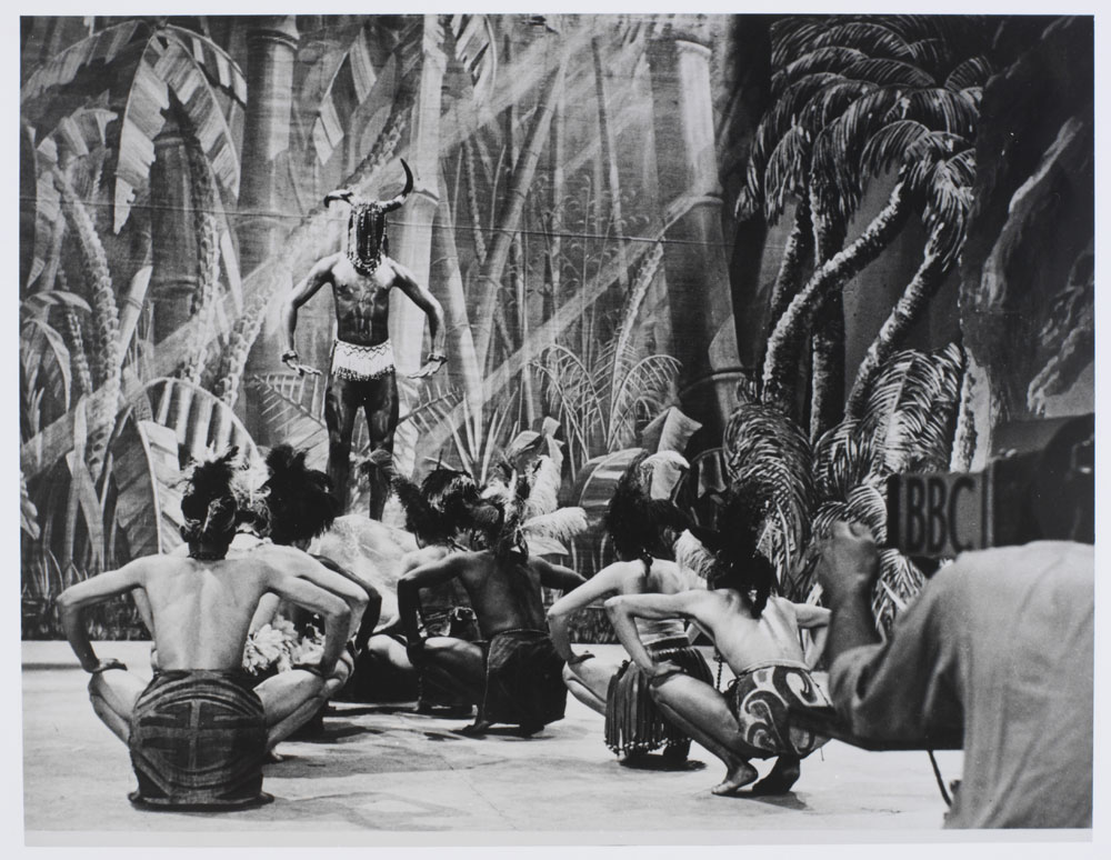 Black and white photograph of dancers on stage in Les Ballet Negres