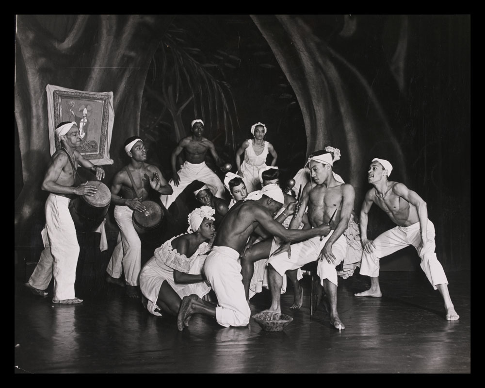 Black and white photograph of performers on stage in Shango-A Caribbean Rhapsody