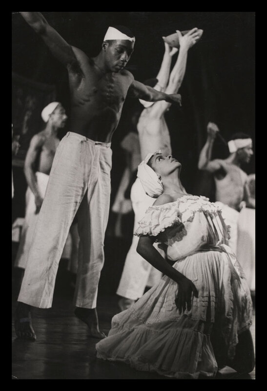 Black and white photograph of performers on stage in Shango-A Caribbean Rhapsody