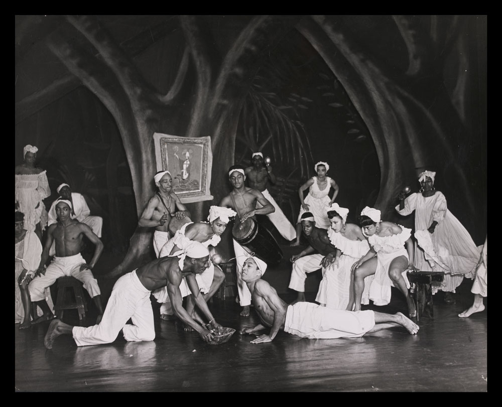 Black and white photograph of performers on stage in Shango-A Caribbean Rhapsody