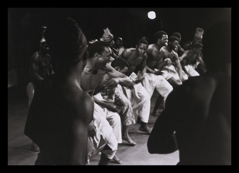 Black and white photograph of dancers on stage in Ballet Africains