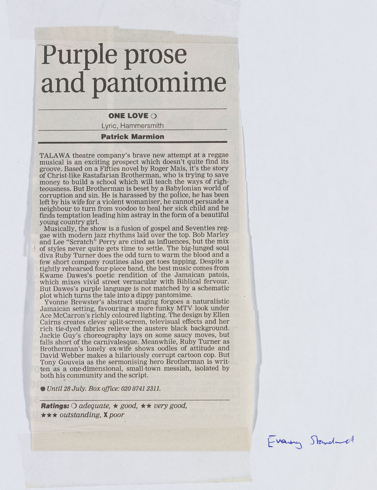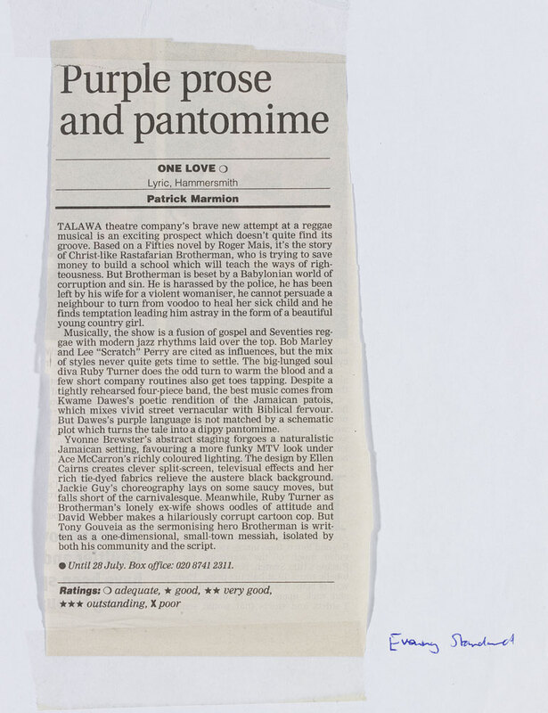 Purple prose and pantomime': an article from Evening Standard for One Love at Lyric Theatre, Hammersmith