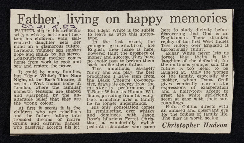 Father, living on happy memories': a newspaper cutting reviewing The Nine Night