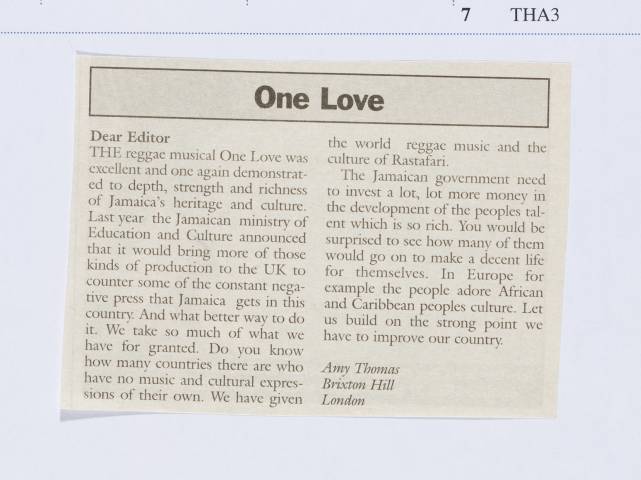 Letter to The Weekly Gleaner about One Love at Lyric Theatre Hammersmith