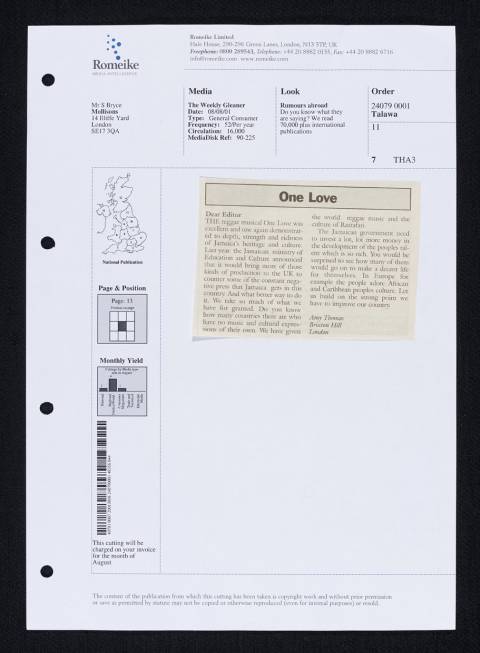 Letter to The Weekly Gleaner about One Love at Lyric Theatre Hammersmith 2